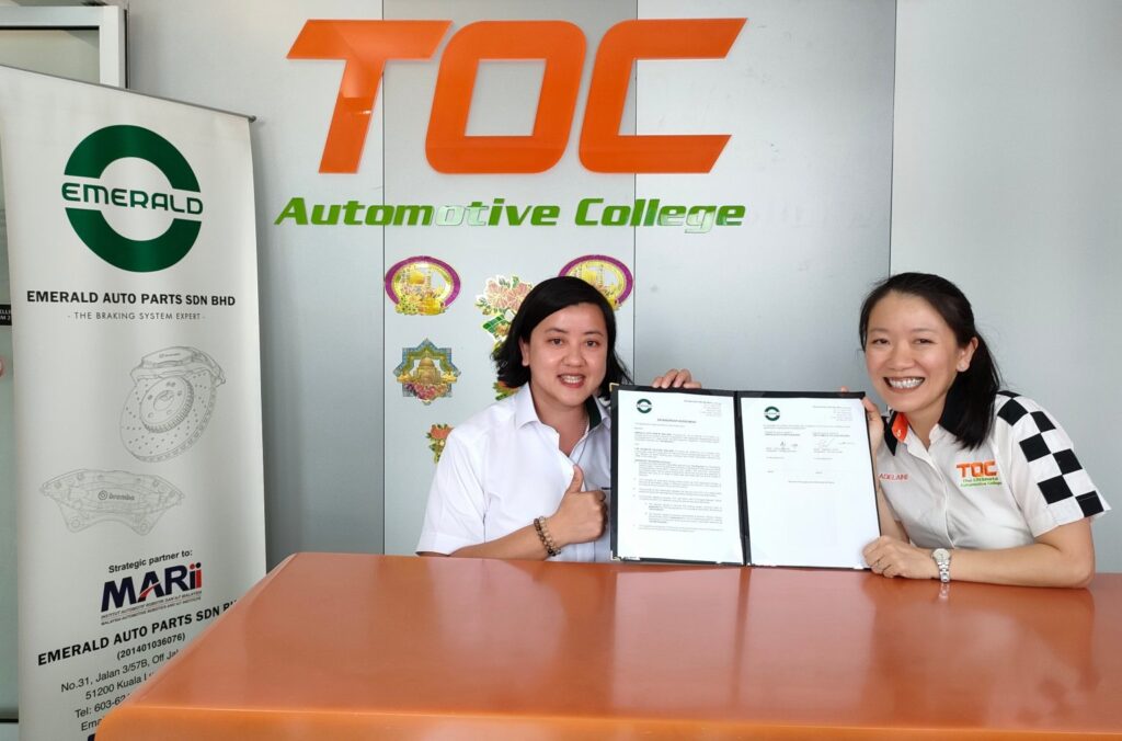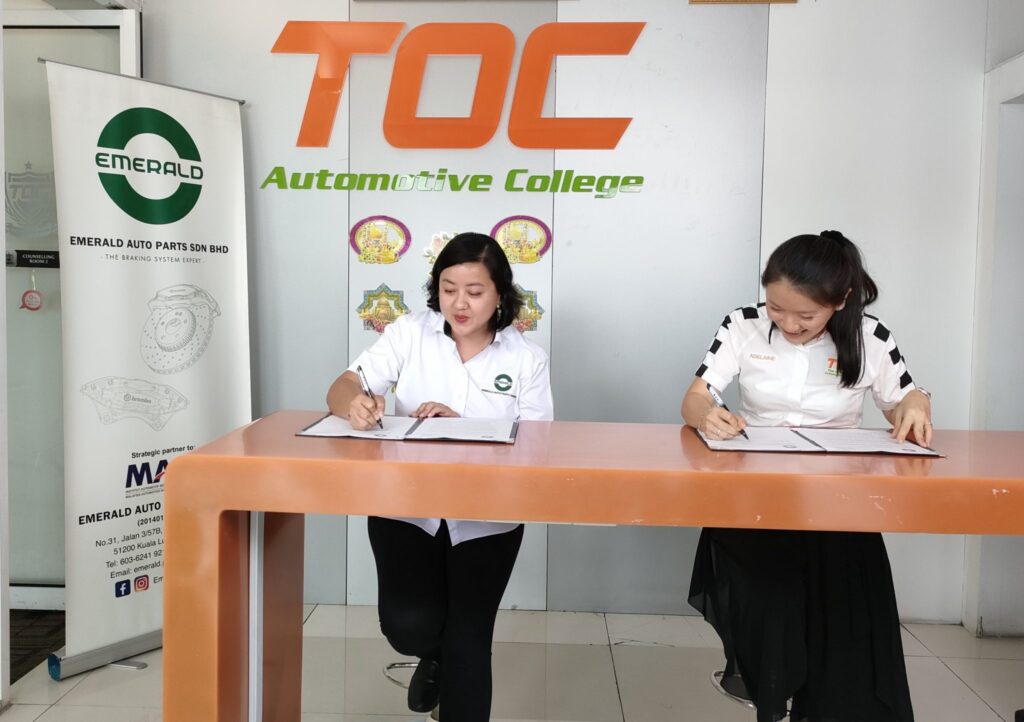 The impactful agreement were signed by Hong Lee Ching, Managing Director of Emerald Auto Parts Sdn. Bhd. and Adelaine Foo, CEO and Founder of TOC Automotive College in TOC Petaling Jaya, Selangor.